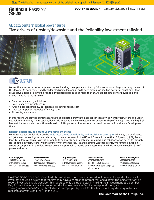 【Goldman Sachs】【20250112】AI/data centers' global power surge Five drivers of upside/downside and the Reliability investment tailwind-28页