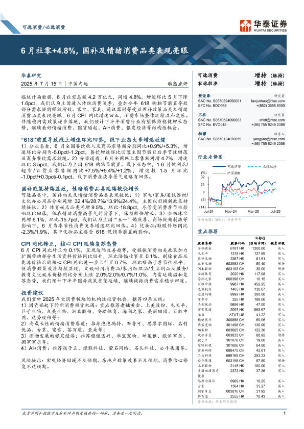 【华泰证券】【202507】可选消费行业:6月社零+4.8%,国补及情绪消费品类表现亮眼-14页