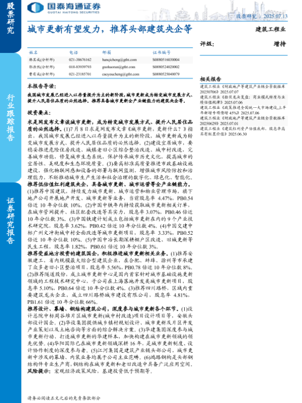 【国泰海通证券】【20250713】建筑工程行业:城市更新有望发力,推荐头部建筑央企等-23页