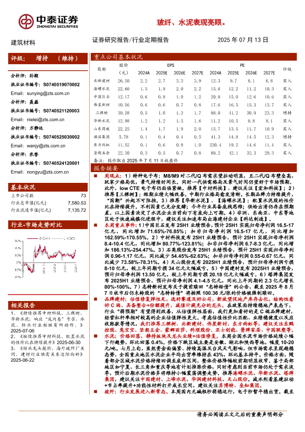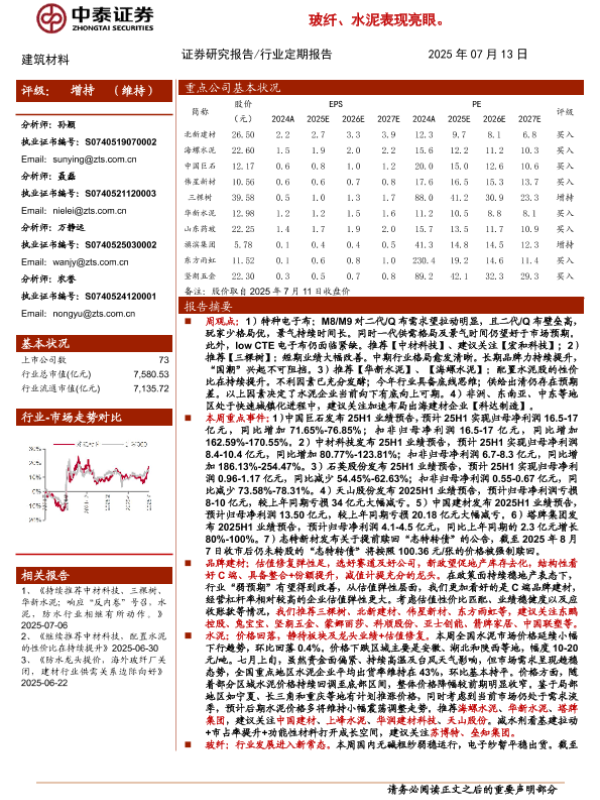 【中泰证券】【20250713】建筑材料行业:持续推荐中材科技、三棵树、华新水泥;25H1业绩预告密集出炉,玻纤、水泥表现亮眼-19页