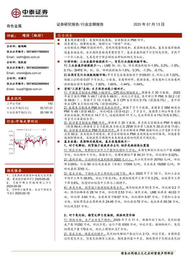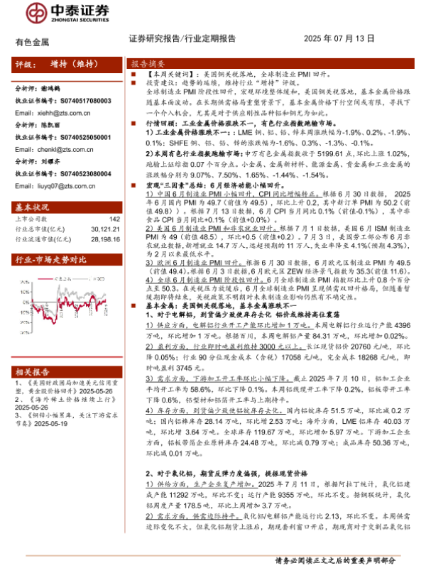 【中泰证券】【20250713】有色金属行业:美国铜关税落地,基本金属涨跌不一-24页