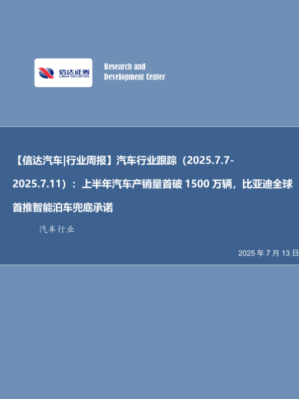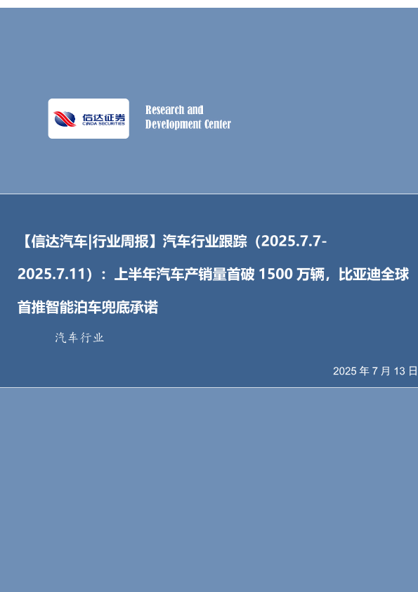 【信达证券】【20250713】汽车行业跟踪:上半年汽车产销量首破1500万辆,比亚迪全球首推智能泊车兜底承诺-13页