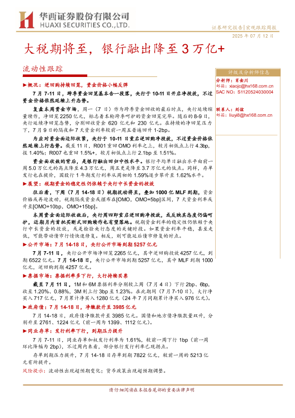 【华西证券】【202507】流动性跟踪:大税期将至,银行融出降至3万亿+-15页