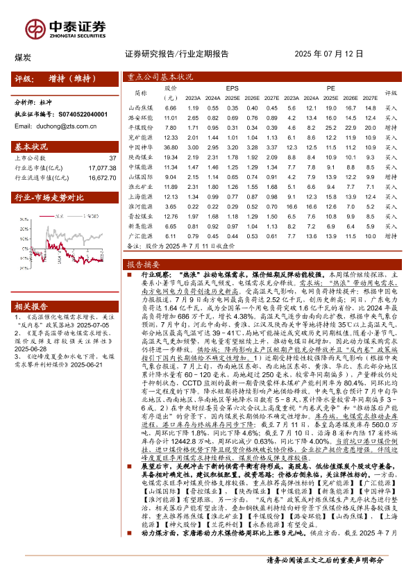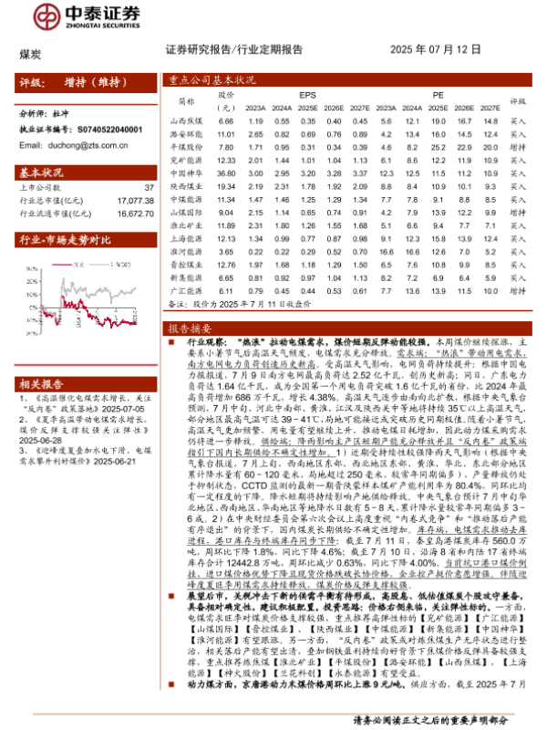 【中泰证券】【20250712】煤炭行业:供需边际改善料持续,煤价反弹有望超预期-23页