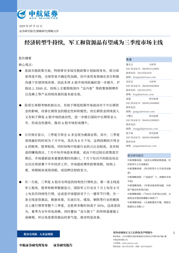 【中航证券】【202407】经济转型牛持续,军工和资源品有望成为三季度市场主线-11页
