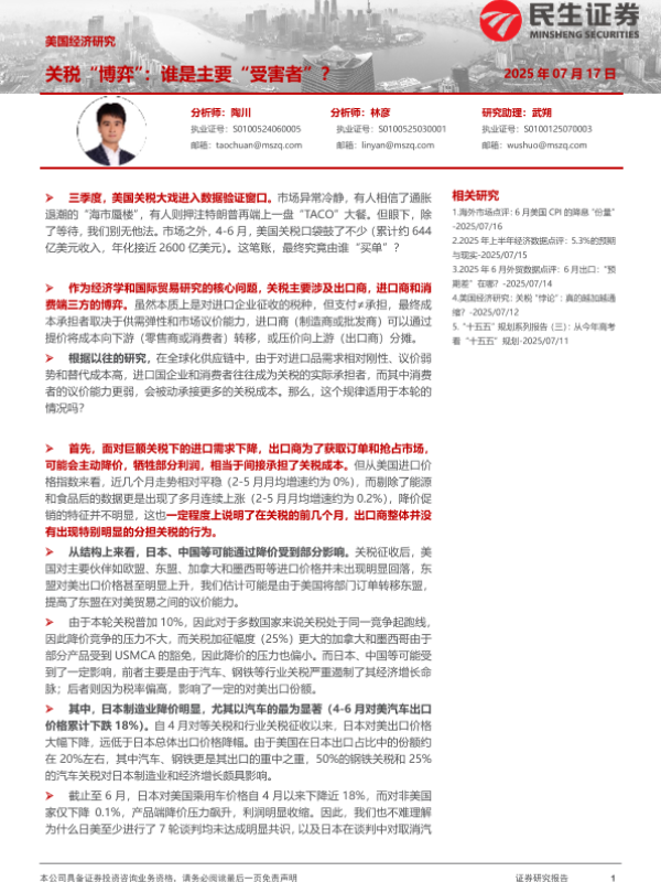 【民生证券】【20250717】美国经济研究:关税“博弈”,谁是主要“受害者”?-10页
