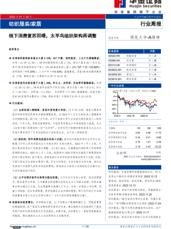 【华金证券】【20230102】纺织服装家居行业周报:线下消费复苏回暖,太平鸟组织架构再调整-20页