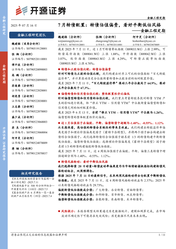 【开源证券】【20250716】7月转债配置,转债估值偏贵,看好平衡低估风格-11页