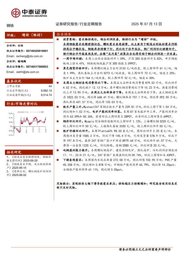 【中泰证券】【20250713】钢铁行业:需求维持高位,钢企利润改善-17页
