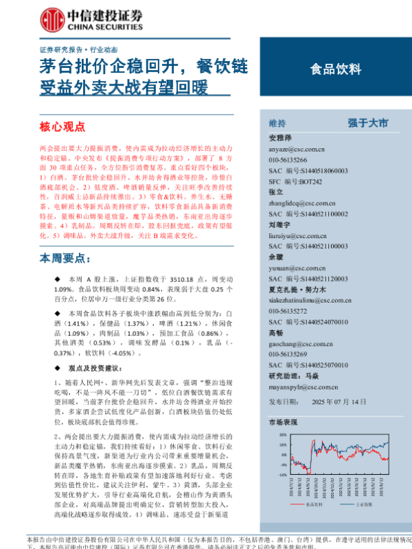 【中信建投证券】【20250714】食品饮料行业:茅台批价企稳回升,餐饮链受益外卖大战有望回暖-18页