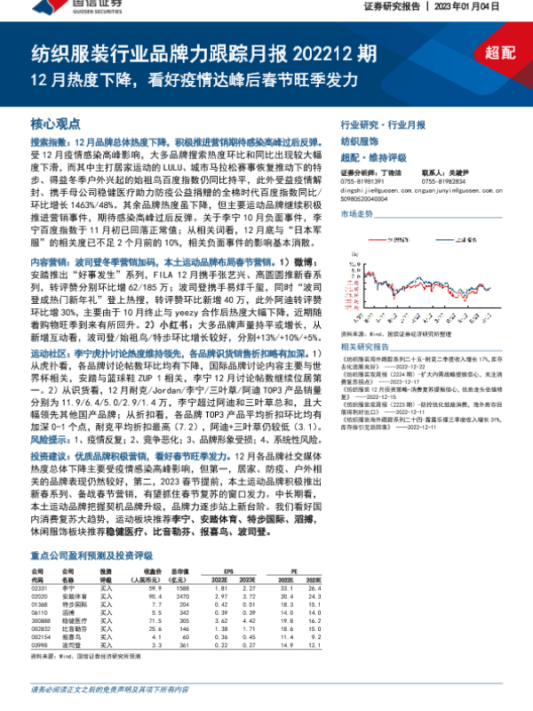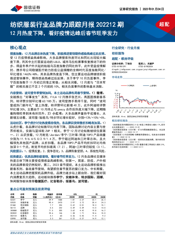 【国信证券】【20230104】纺织服装行业品牌力跟踪月报202212期:12月热度下降,看好疫情达峰后春节旺季发力-24页