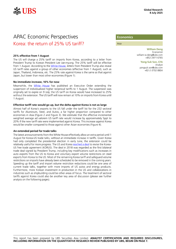 【UBS Securities Asia Limited】【20250708】Korea the return of 25% US tariff?-10页