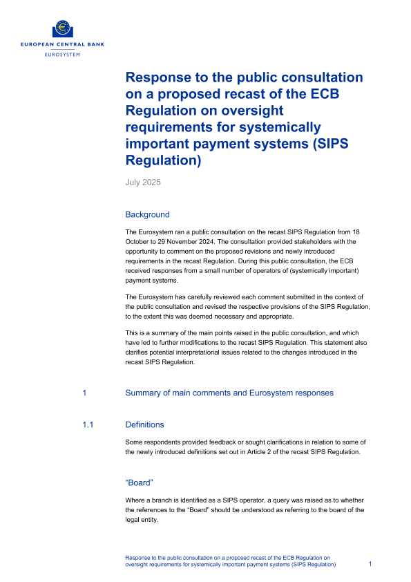 【European Central Bank】【202507】Response to the public consultation on a proposed recast of the ECB Regulation on oversight requirements for systemically important payment systems (SIPS Regulation)-6页