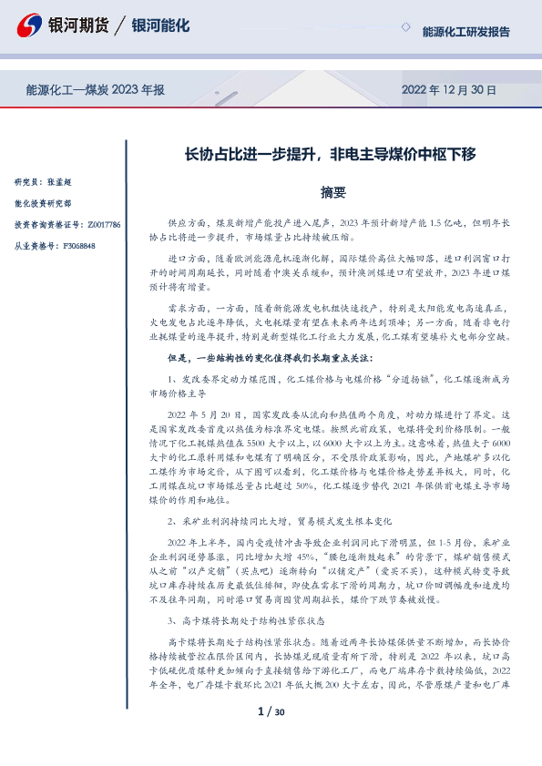 【银河期货】【20221230】能源化工_煤炭2023年报:长协占比进一步提升,非电主导煤价中枢下移-30页
