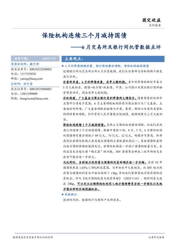 【华安证券】【20250723】6月交易所及银行间托管数据点评:保险机构连续三个月减持国债-16页