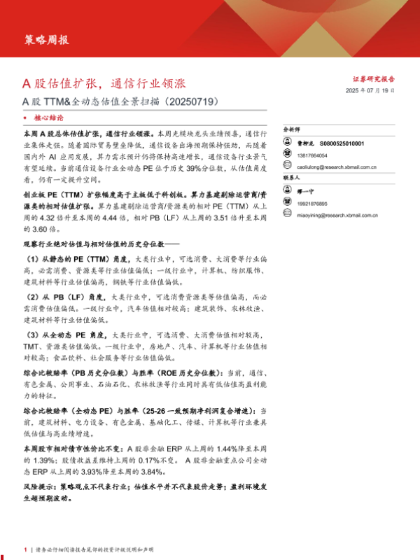全动态估值 A股估值 通信行业 投资策略 市场分析
