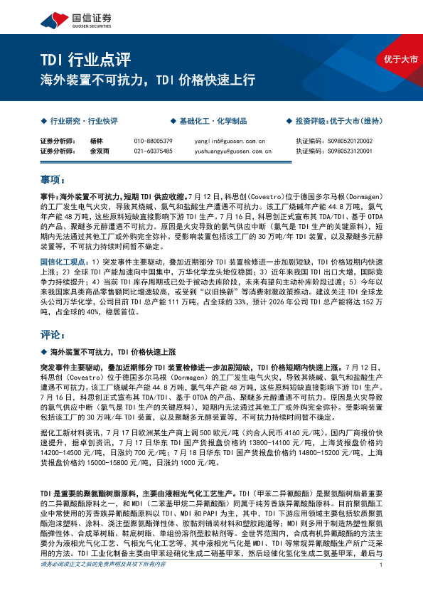 【国信证券】【20230725】TDI行业点评:海外装置不可抗力,TDI价格快速上行-10页