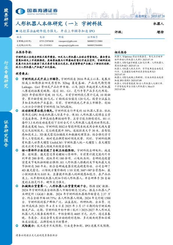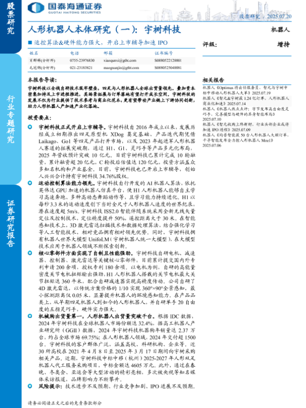 【国泰海通证券】【20250720】人形机器人行业本体研究(一):宇树科技-12页