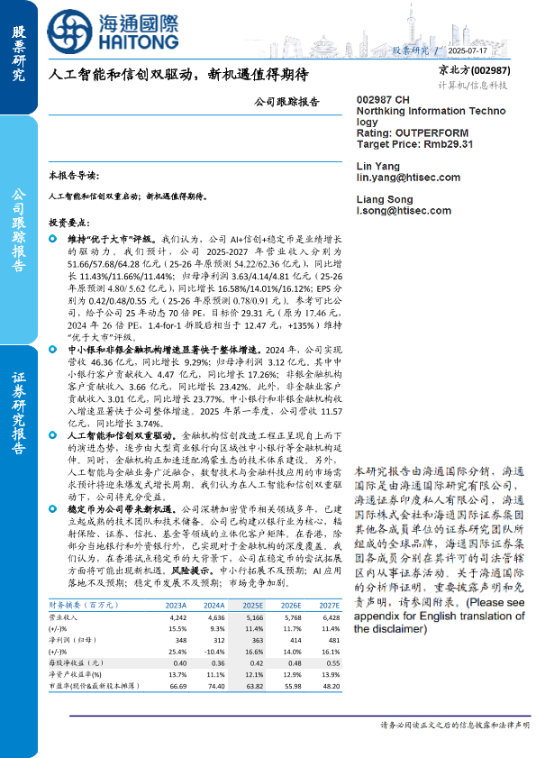 【海通国际】【20250717】京北方(002987)公司跟踪报告:人工智能和信创双驱动,新机遇值得期待-11页