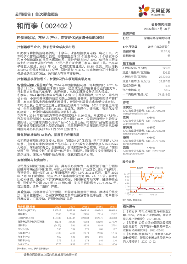 【天风证券】【20250720】和而泰(002402)控制器领军,布局AI产业,向智能化发展增长动能强劲!-29页