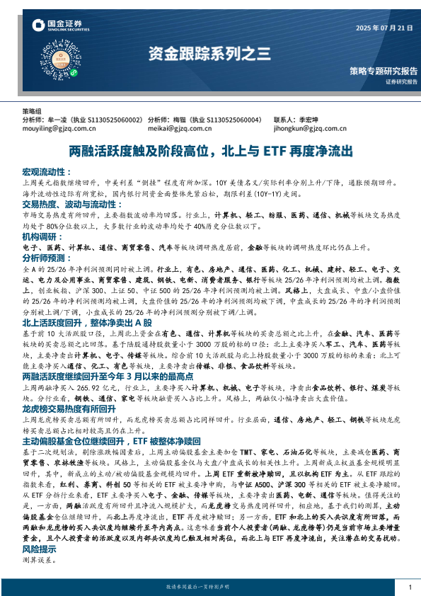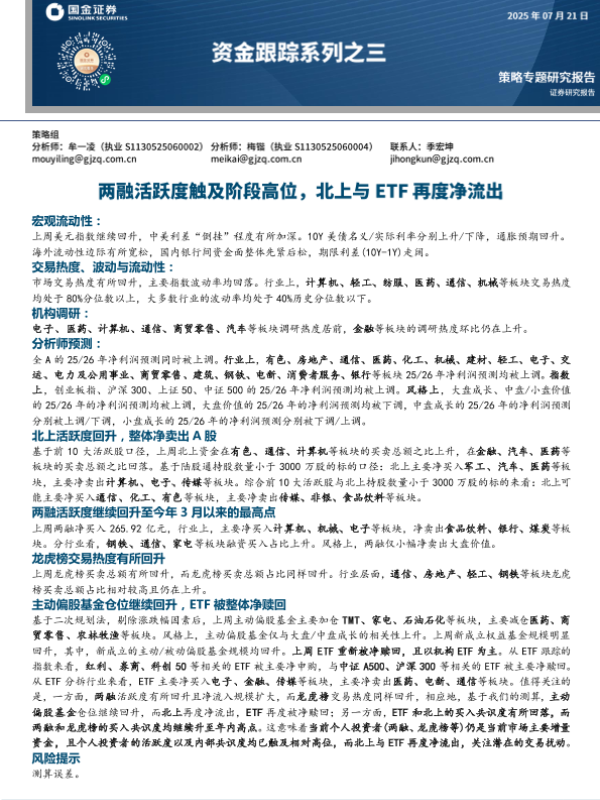 【国金证券】【20250721】资金跟踪系列之三:两融活跃度触及阶段高位,北上与ETF再度净流出-32页
