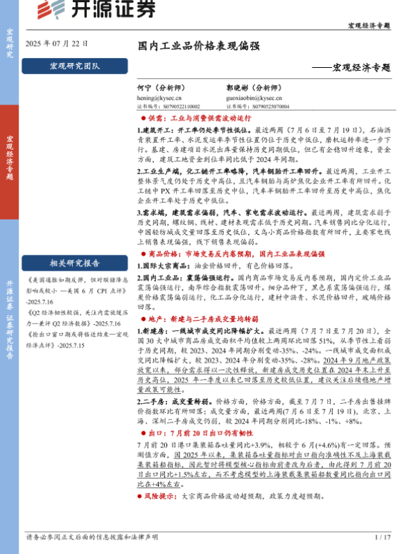 宏观经济 房地产市场 工业品价格 出口数据 供需分析