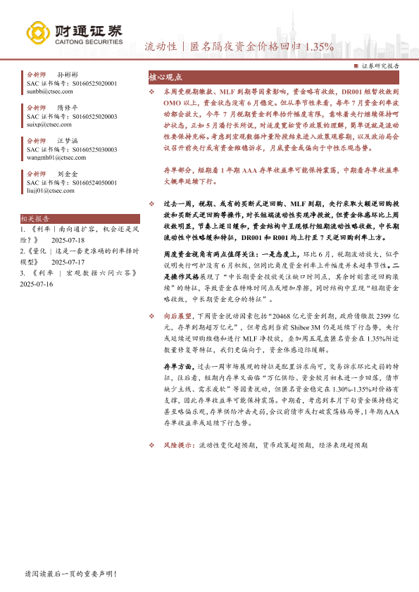 【财通证券】【20250719】流动性|匿名隔夜资金价格回归1.35%-25页