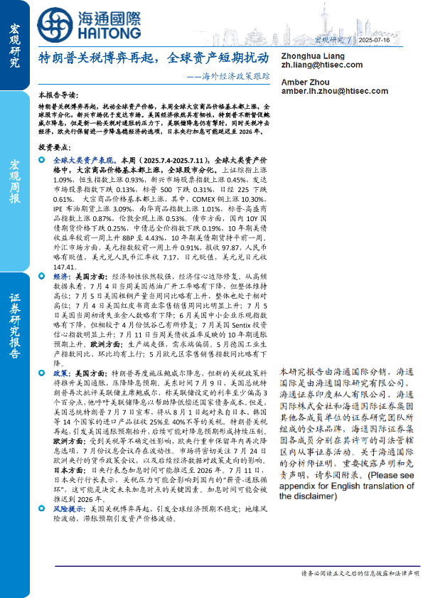 【海通国际】【20250716】海外经济政策跟踪:特朗普关税博弈再起,全球资产短期扰动-14页
