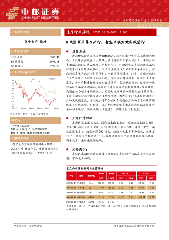 【中邮证券】【20221231】通信行业周报:C-V2X商用势在必行,智能网联方案实践前行-24页