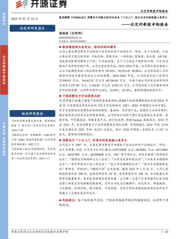 【开源证券】【20250719】鼎佳精密北交所新股申购报告:消费电子功能与防护双龙头“小巨人”,技术与专利构筑核心竞争力-30页
