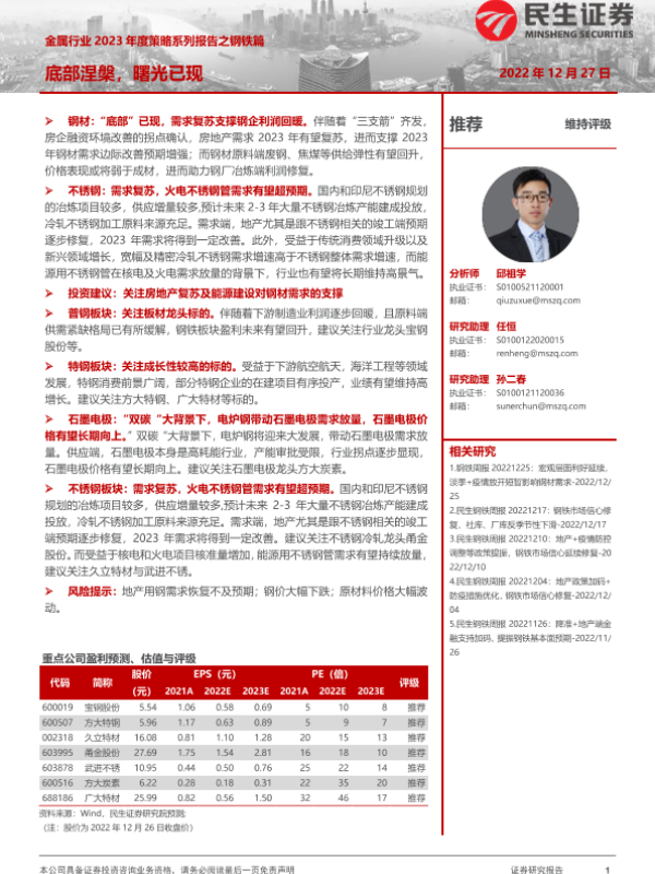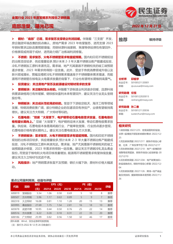 【民生证券】【20221227】金属行业2023年度策略系列报告之钢铁篇:底部涅槃,曙光已现-54页