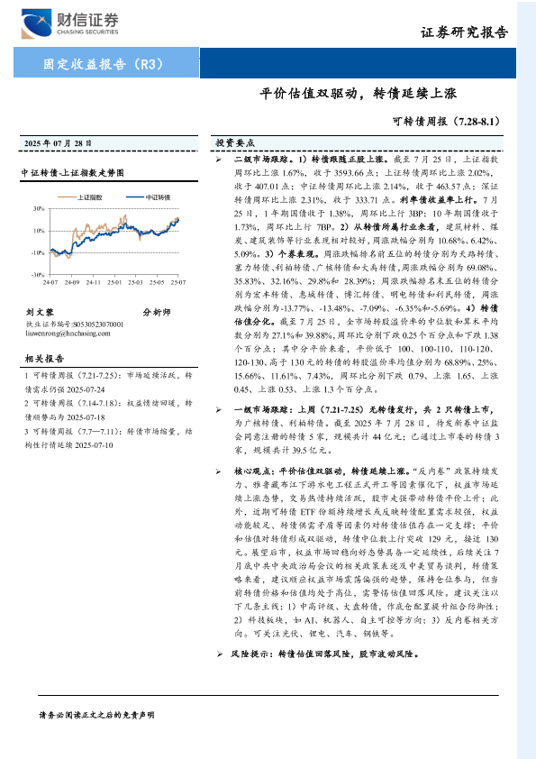 【财信证券】【20250728】可转债周报:平价估值双驱动,转债延续上涨-10页