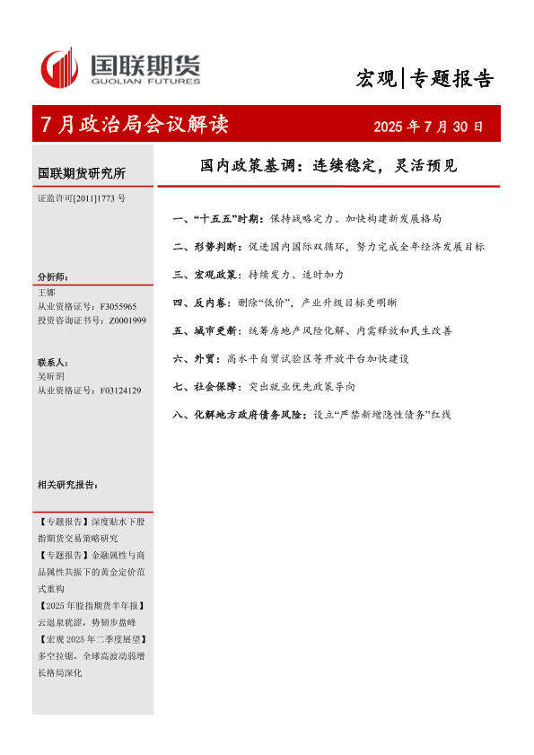 【国联期货】【20250730】7月政治局会议解读_国内政策基调_连续稳定_灵活预见-7页