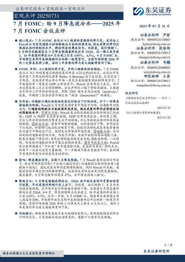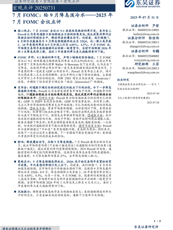【东吴证券】【20250731】7月 FOMC:给 9月降息泼冷水——2025年 7月 FOMC会议点评-5页