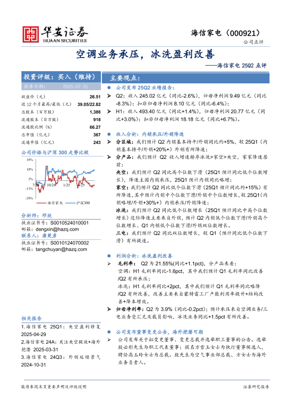 【华安证券】【20250731】海信家电25Q2点评_空调业务承压_冰洗盈利改善-4页