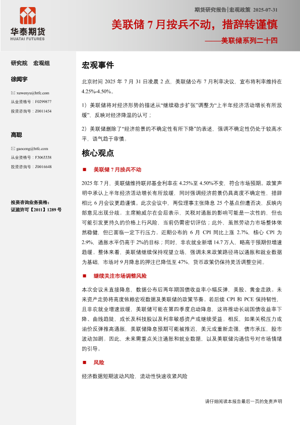 【华泰期货】【20250731】美联储7月暂停降息_措辞转谨慎-6页