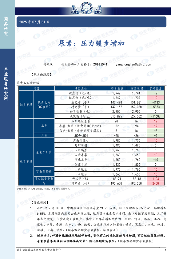 【国泰君安期货】【20250731】尿素:压力缓步增加-3页