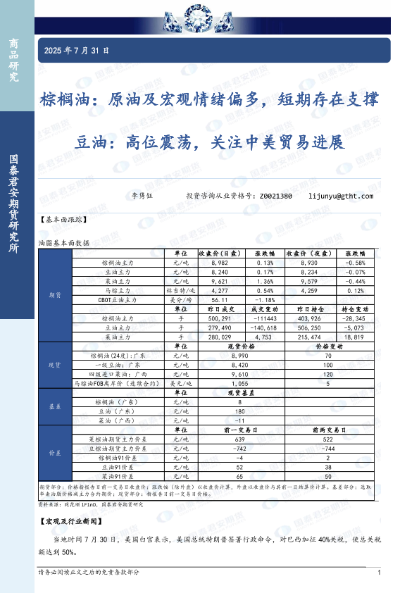 【国泰君安期货】【20250731】棕榈油_原油及宏观情绪偏多_短期存在支撑_豆油_高位震荡_关注中美贸易进展-3页