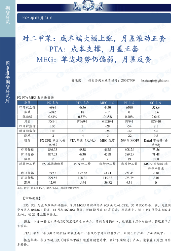 【国泰君安期货】【20250731】对二甲苯:成本端大幅上涨,月差滚动正套 PTA:成本支撑,月差正套 MEG:单边趋势仍偏弱,月差反套-3页