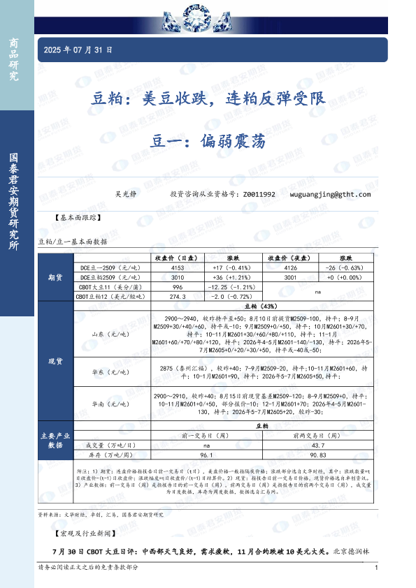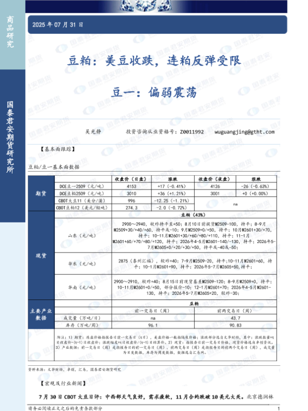 【国泰君安期货】【20250731】豆粕_美豆收跌_连粕反弹受限_豆一_偏弱震荡-3页