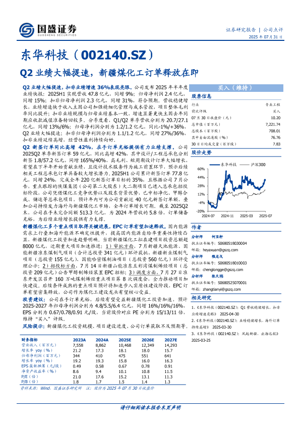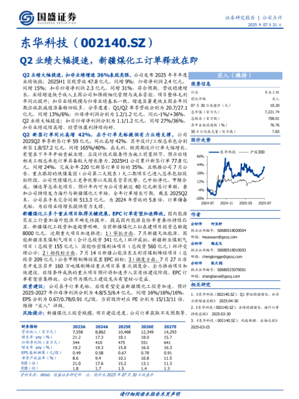 订单 煤化工 东华科技 业绩增长 EPC