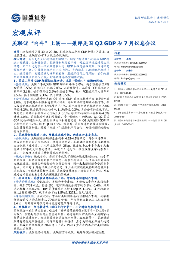 【国盛证券】【20250731】美联储“内斗”上演——兼评美国 Q2 GDP和 7月议息会议-5页