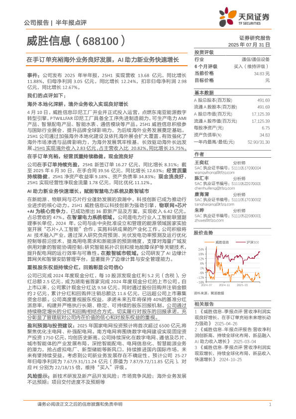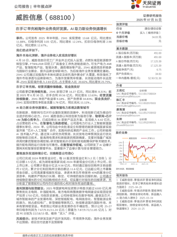 【天风证券】【20250731】威胜信息-在手订单充裕海外业务良好发展_AI助力新业务快速增长-4页