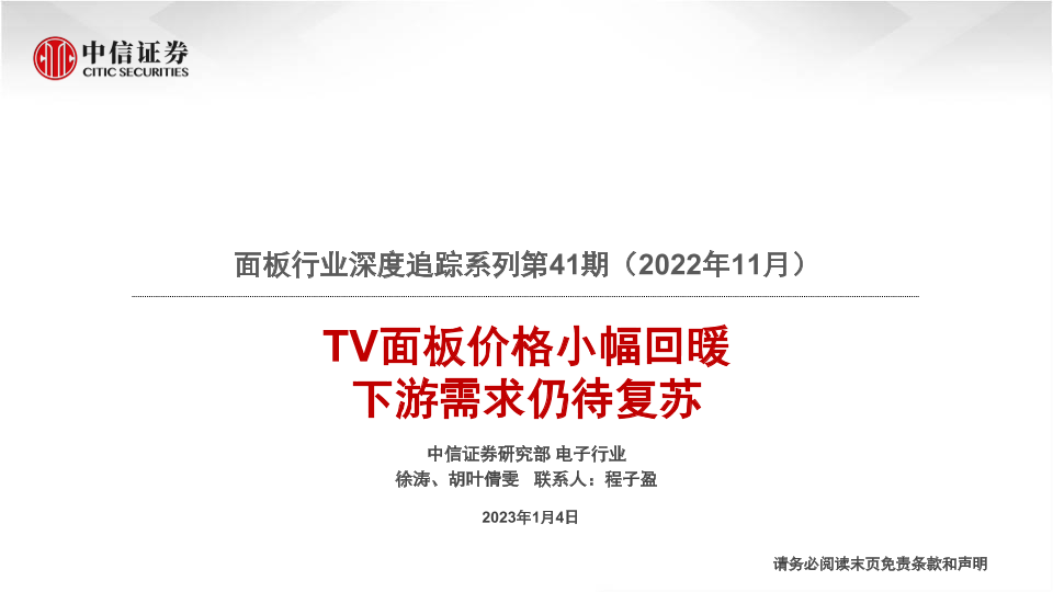 【中信证券】【20230104】面板行业深度追踪系列第41期(2022年11月):TV面板价格小幅回暖,下游需求仍待复苏-22页