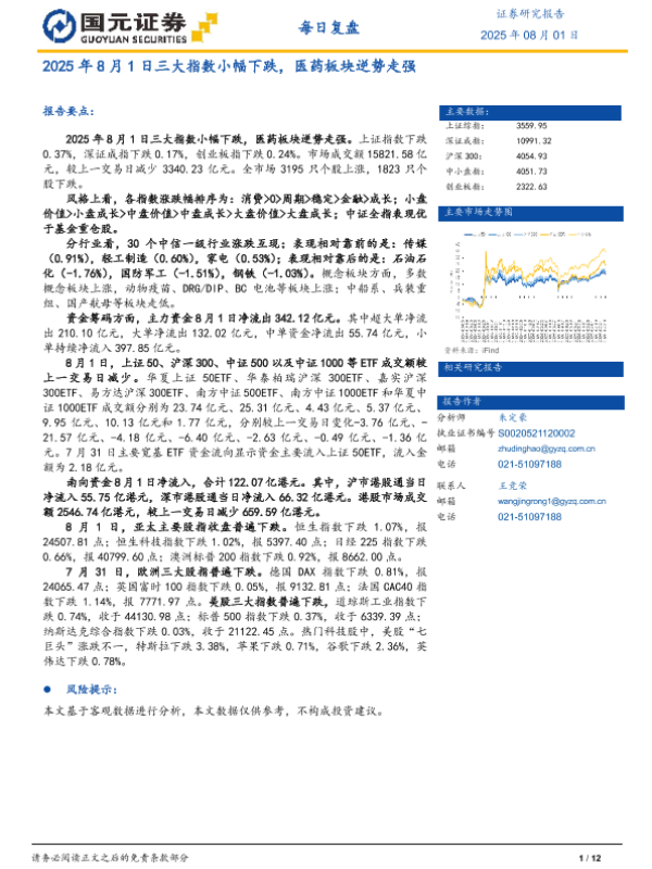 【国元证券】【20250801】每日复盘_三大指数小幅下跌_医药板块逆势走强-12页