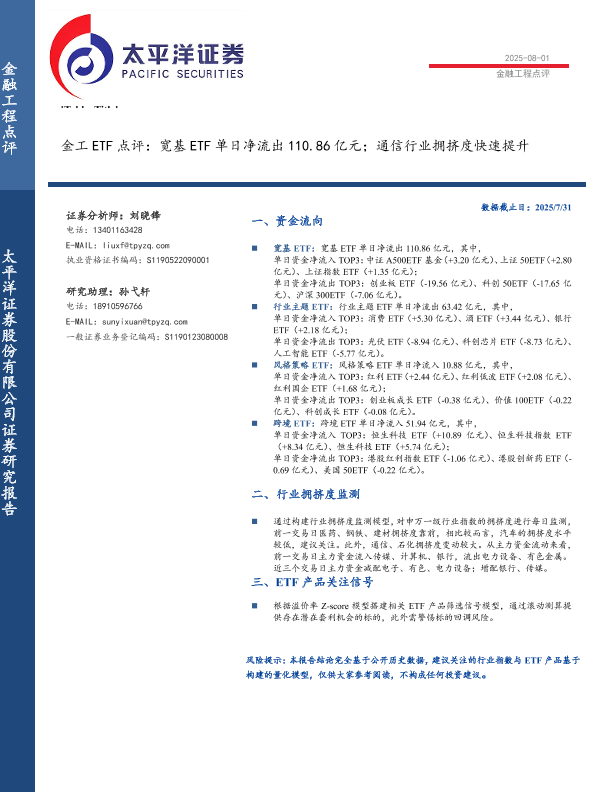 【太平洋证券】【20250801】金工ETF点评:宽基ETF单日净流出110.86亿元;通信行业拥挤度快速提升-6页