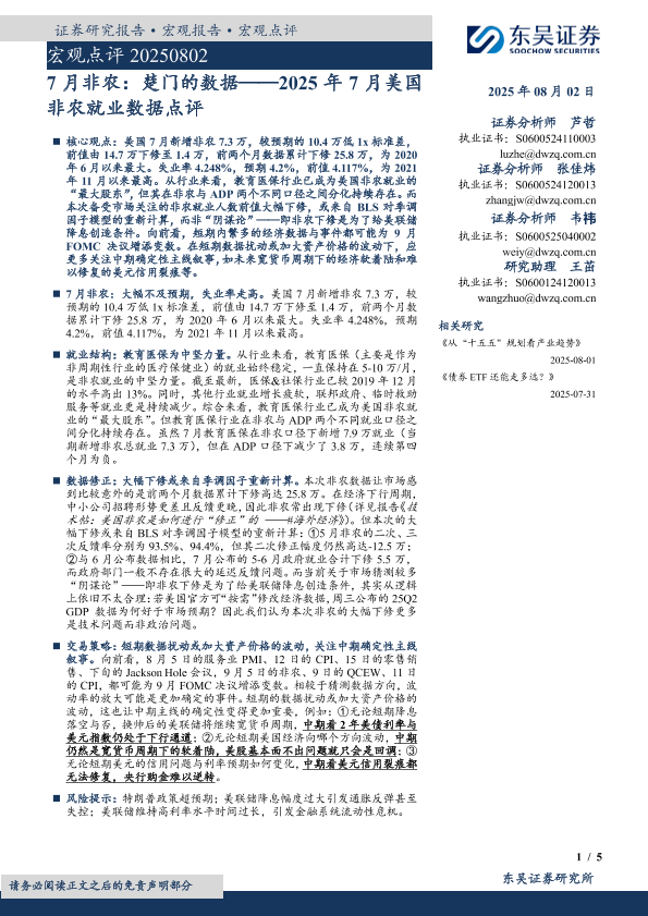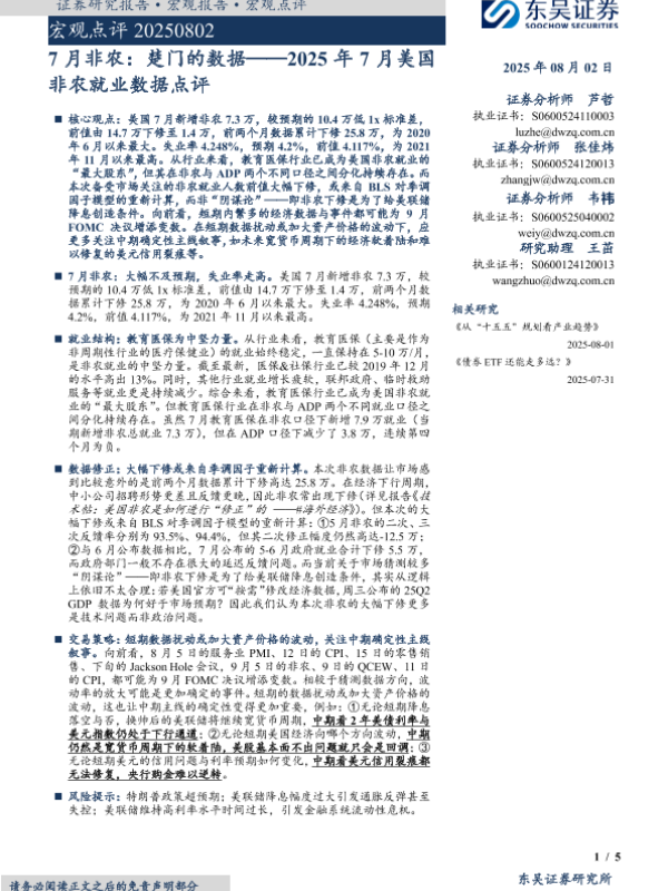 【东吴证券】【20250802】7月非农:楚门的数据——2025年7月美国非农就业数据点评-5页