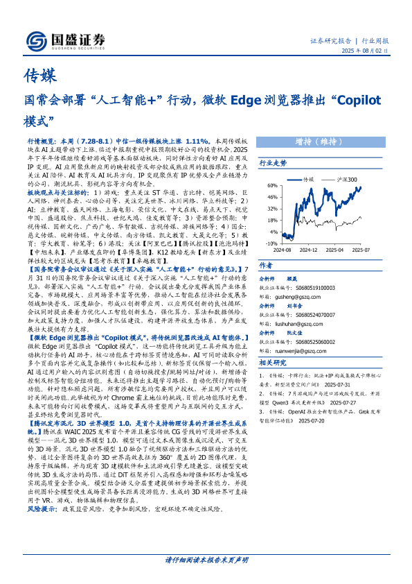 【国盛证券】【20250802】传媒行业周报:国常会部署“人工智能+”行动,微软Edge浏览器推出Copilot模式-11页