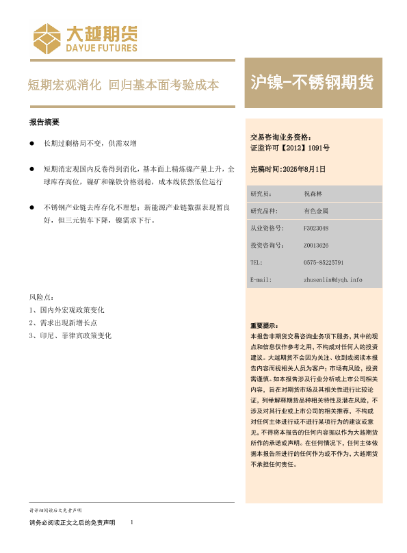 【大越期货】【20250801】沪镍-不锈钢期货_短期宏观消化_回归基本面考验成本-14页