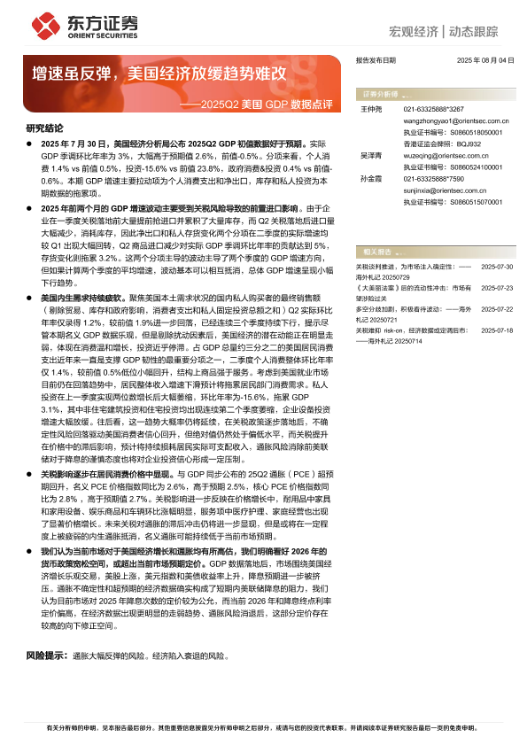 【东方证券】【20250804】2025Q2美国GDP数据点评 增速虽反弹,美国经济放缓趋势难改-5页